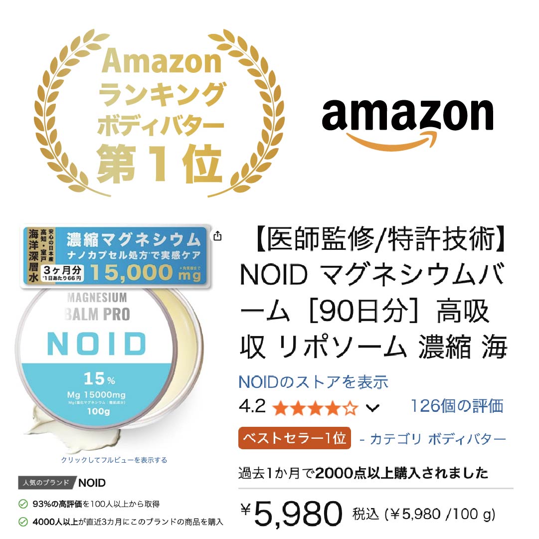 ノイドのマグネシウムバームは、100gの大容量にマグネシウムが15000mgも凝縮された贅沢な一品。超高濃度なのに使い心地がとても良く、毎日のリラックスタイムに欠かせない相棒になっちゃいました!ストレスの多い現代社会で、自分を癒すためのセルフメディケーションにぴったりなんです。